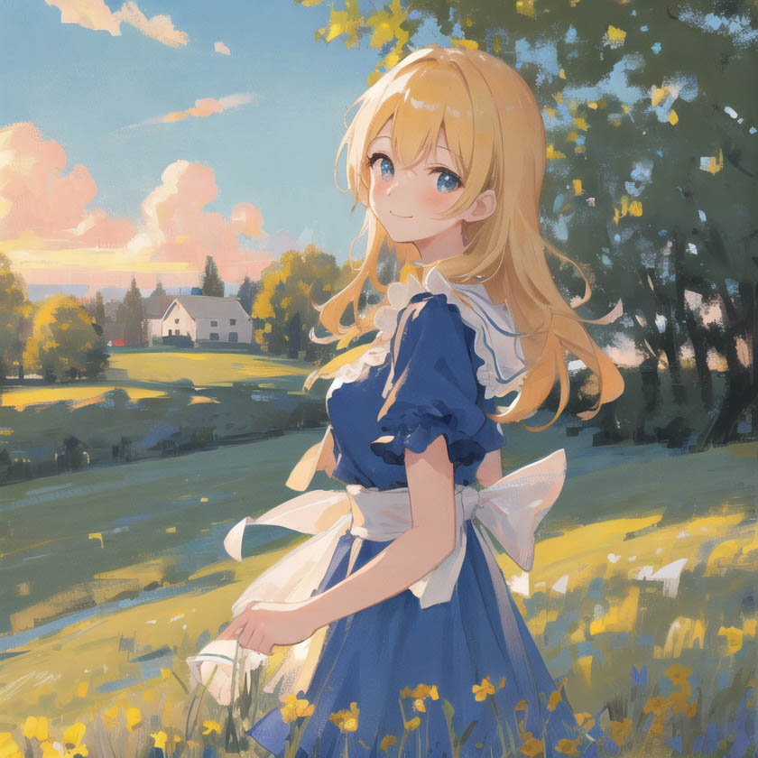 A young girl stands in the midst of a summer landscape, surrounded by rich nature, as a clear blue sky stretches above her. The bright and colorful animated style brings out the warmth and joy of the vibrant summer day.